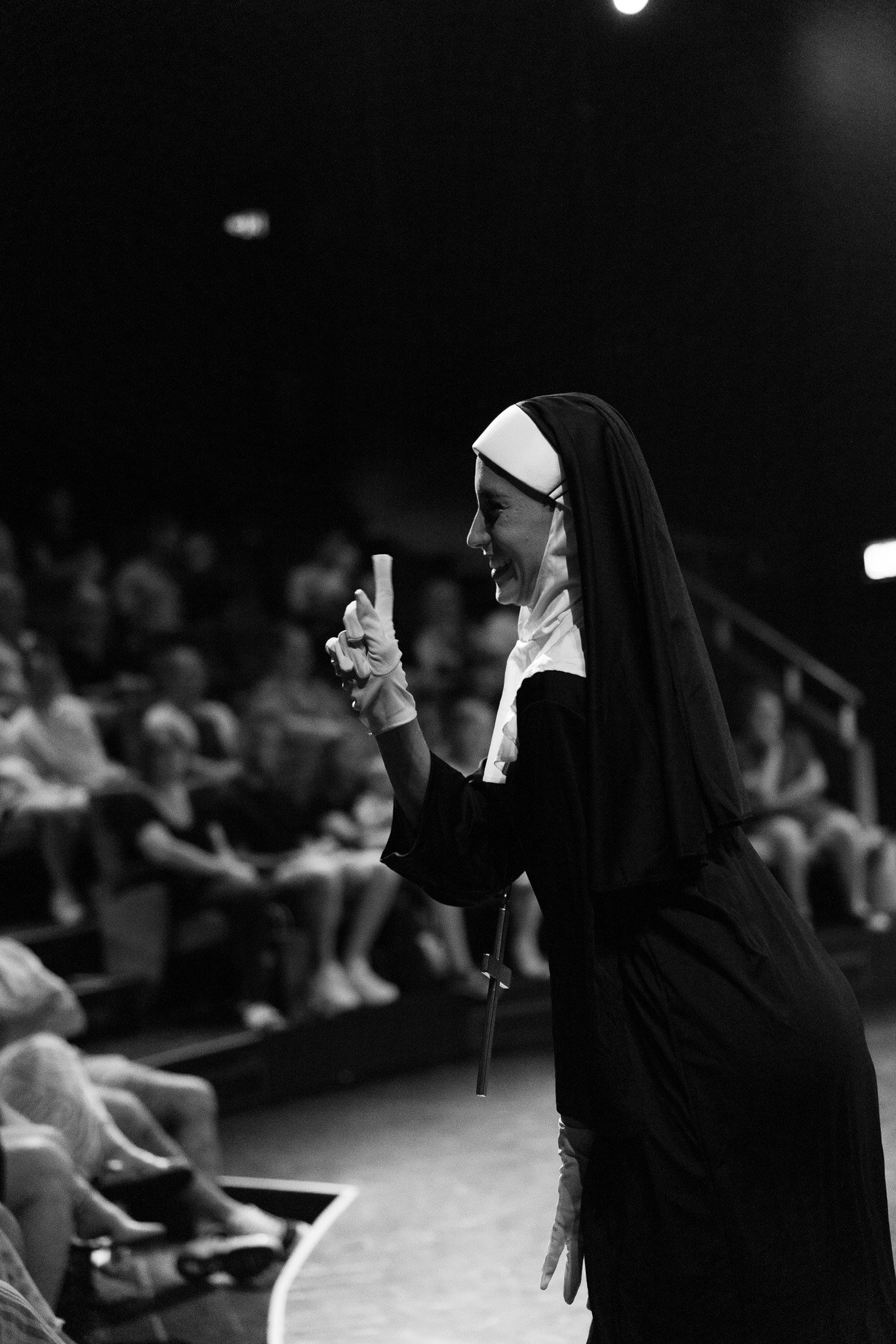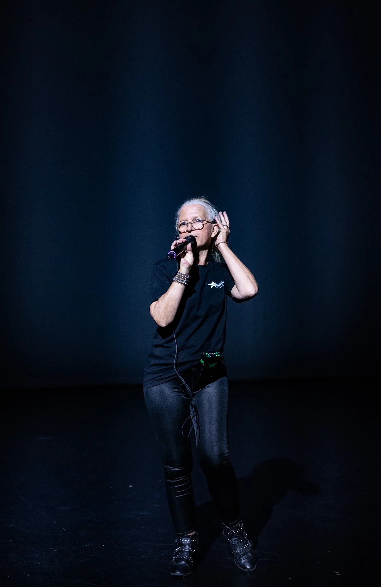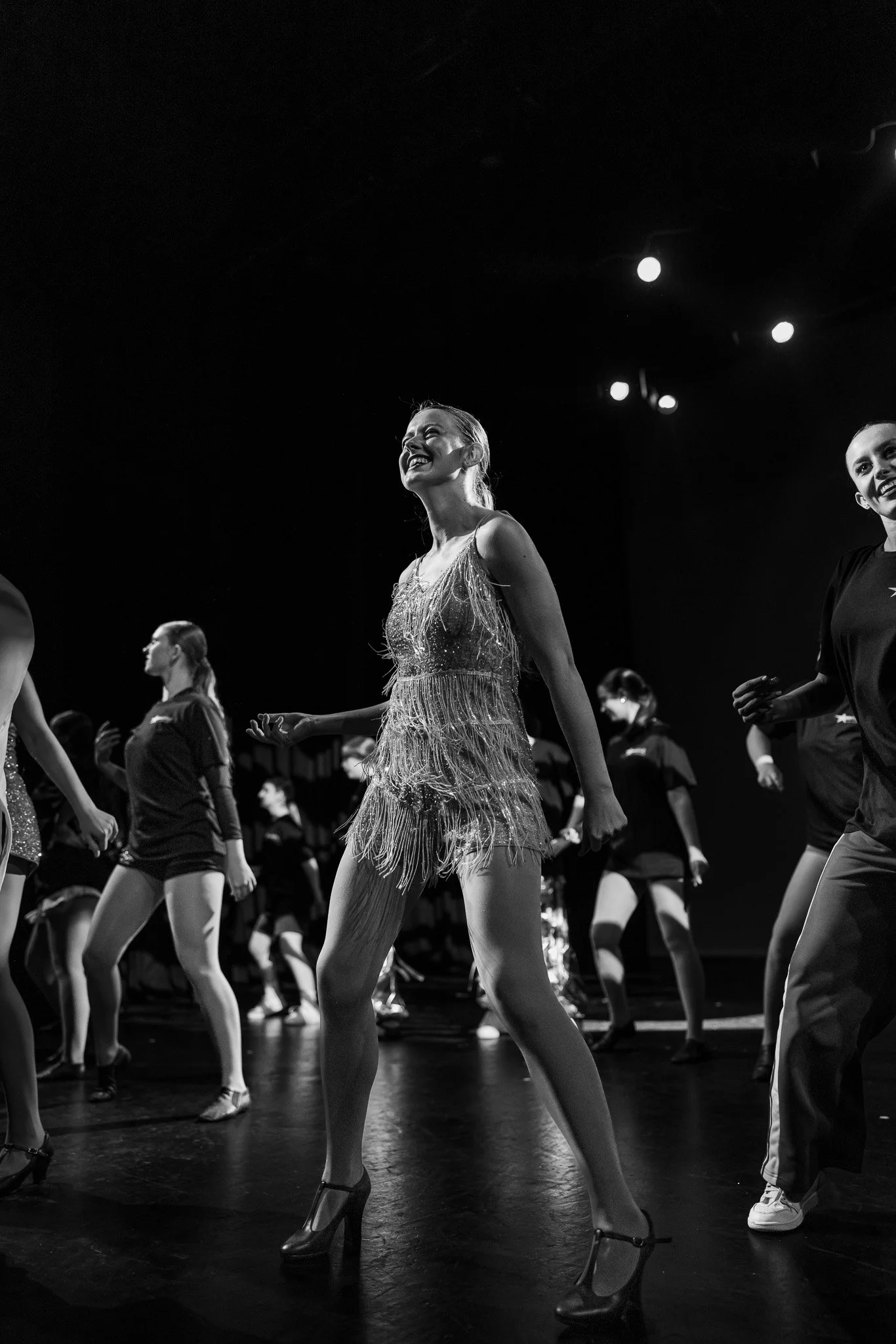 Young girl in a black dance costume performing a leap on stage with other dancers in the background.