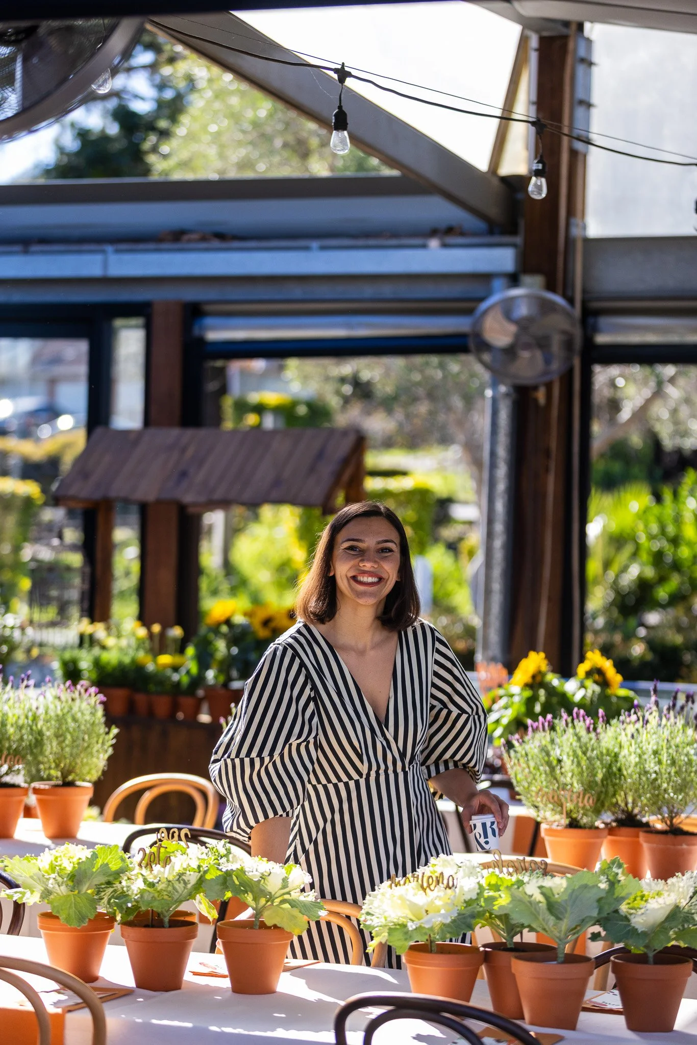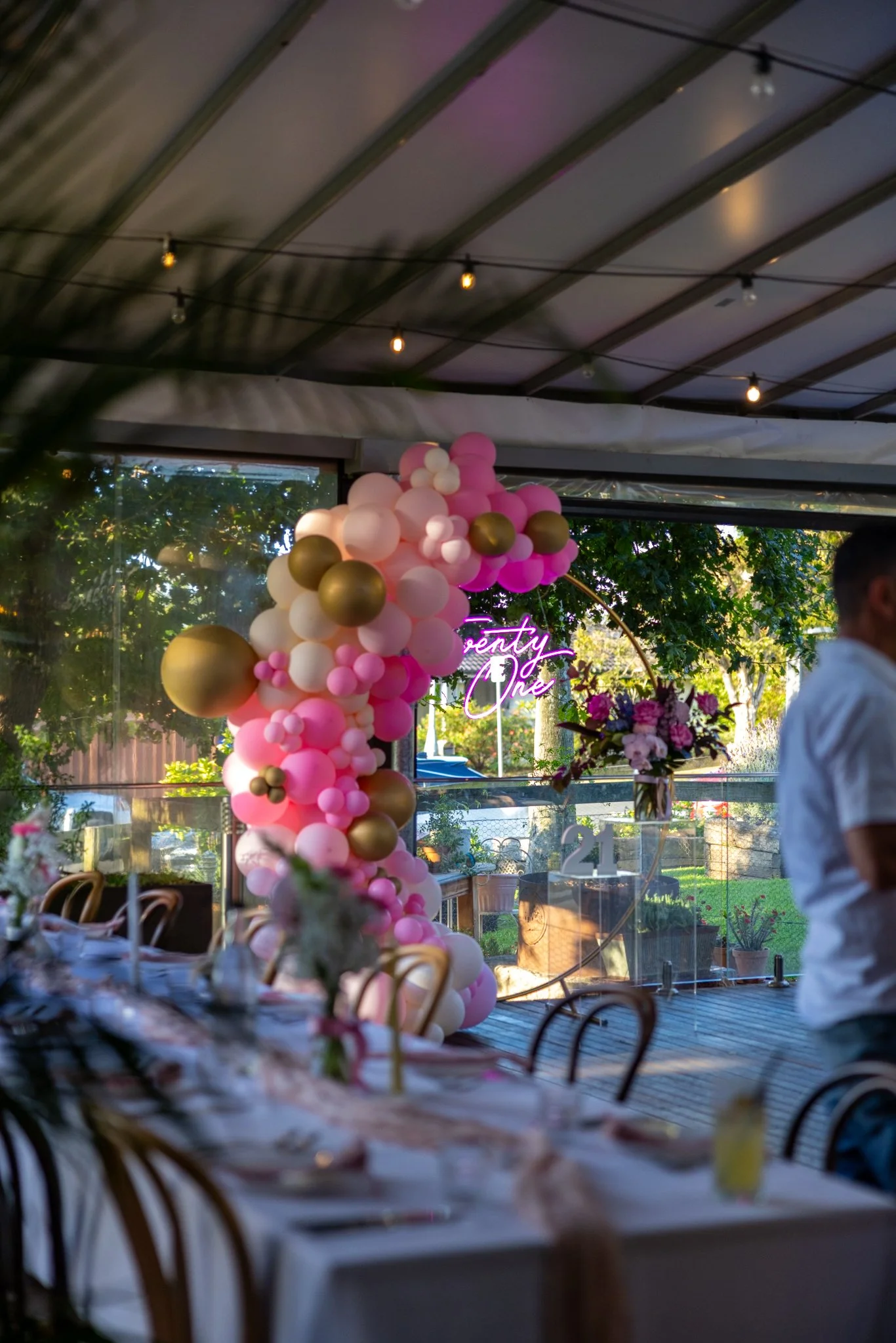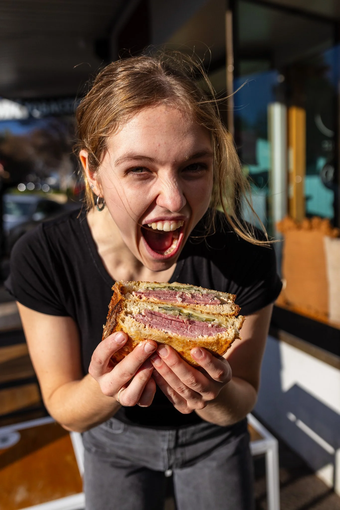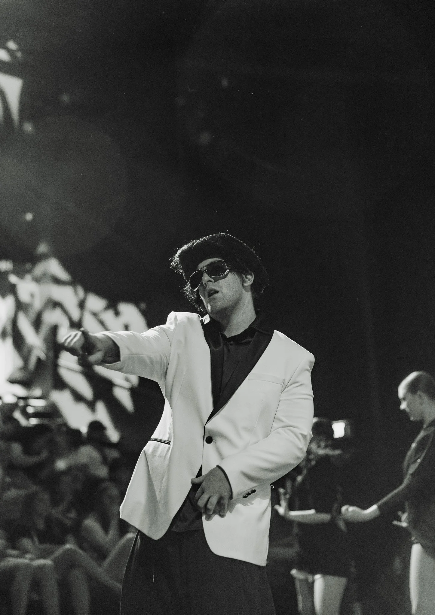 Young girl in a black dance costume performing a leap on stage with other dancers in the background.